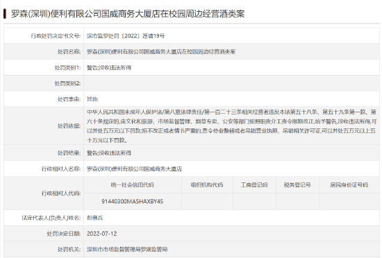 天眼查App显示,近日,罗森(深圳)便利有限公司国威商务大厦店因在校园周边经营酒类,违反未成年人保护法,被深圳市市场监督管理局罗湖监管局给予警告并没收违法所得。