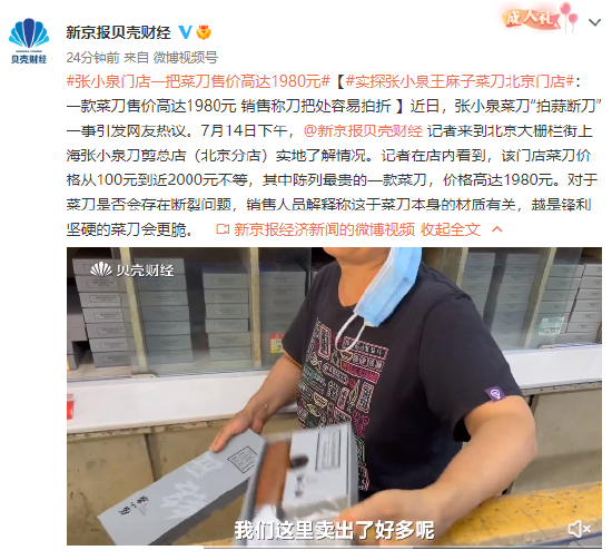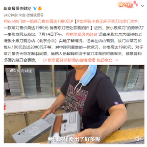 #张小泉门店一把菜刀售价高达1980元#【#实探张小泉王麻子菜刀北京门店#:一款菜刀售价高达1980元 销售称刀把处容易拍折 】近日,张小泉菜刀“拍蒜断刀”一事引发网友热议。7月14日下午,@新京报贝壳财经 记者来到北京大栅栏街上海张小泉刀剪总店(北京分店)实地了解情况。记者在店内看到,该门店菜刀价格从100元到近2000元不等,其中陈列最贵的一款菜刀,价格高达1980元。对于菜刀是否会存在断裂问题,销售人员解释称这于菜刀本身的材质有关,越是锋利坚硬的菜刀会更脆。