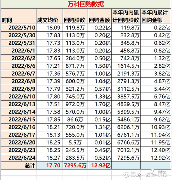 万科5月-6月的回购记录梳理,图源雪球