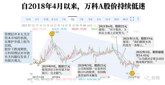 万科股票的讨论区长期充斥着两种声音:坚定万科股价被低估,或者吐槽万科股价低迷。但令股民失望的是,万科管理层在下跌周期的大部分时间里,对股价问题三缄其口。