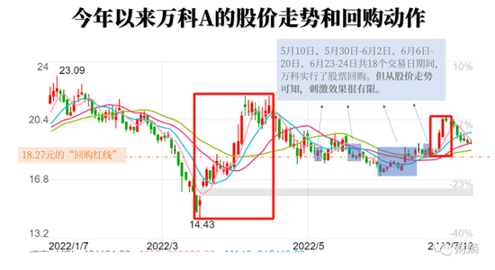 万科股价曾在2022年3月底和6月底出现过两波反弹,分别为万科的年度业绩会和股东大会后的市场反应。然而,盘桓在这两次反弹之间的,是依然疲软乏力的走势——期间万科发布了多个关于实际回购和增持的公告,也无法对股价形成刺激。