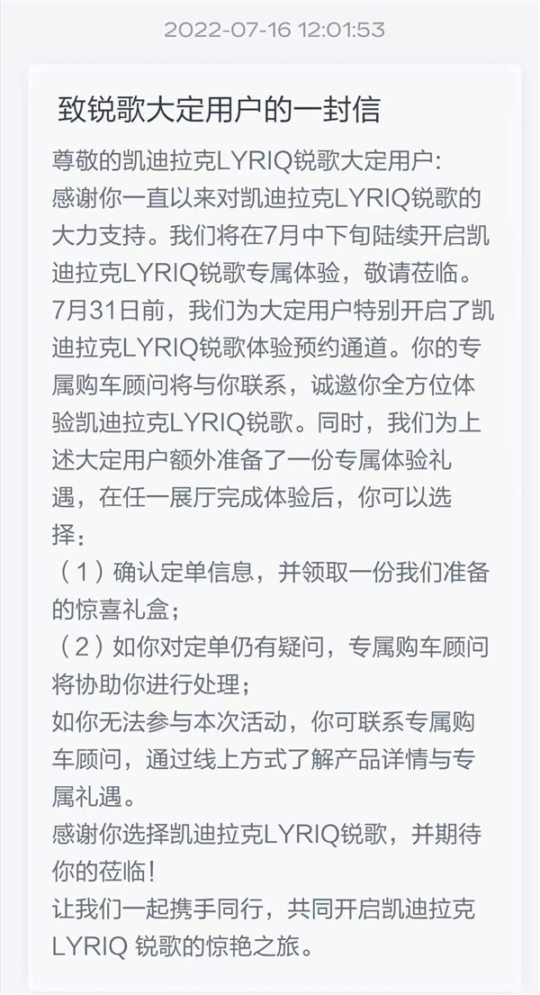 在这种情况下,凯迪拉克官方昨日向车主致歉,并发表了一封致 LYRIQ 锐歌大定用户的一封信。上汽通用在信中表示: