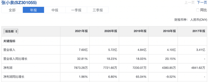 纵观张小泉2017年至2021年间的营收数据情况,其经营数据增幅平稳,但利润变化忽高忽低,并且在最近三年增幅逐年萎缩,2017年至2021年,张小泉的净利润为0.44亿元、0.72亿元、0.77亿元、0.79亿元。尤其是2021年,张小泉出现增收不增利的情况,其财报数据显示,张小泉营业收入增长32.81%,净利润却仅增1.96%。