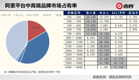 国金证券统计了阿里平台上价格在300元以上的刀具销量,张小泉以16.42%的品牌占有率位列第二,而双立人位列第一。其中700元以上的刀具市场,双立人基本占据半壁江山。