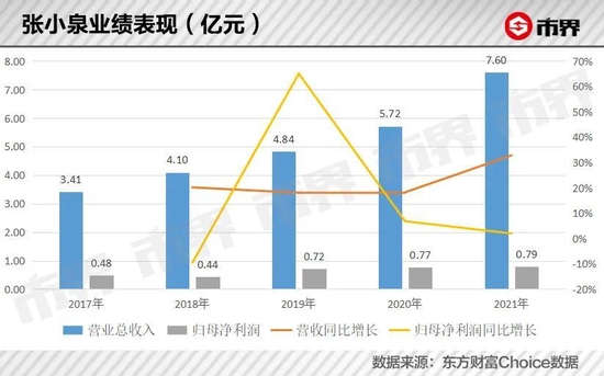 从总的业绩表现看,2017年至2021年,张小泉的营业收入从3.41亿元增长至7.6亿元,年均复合增长率为22.2%,归属于母公司的净利润从0.48亿元增长至0.79亿元,年均复合增长率为13.3%。