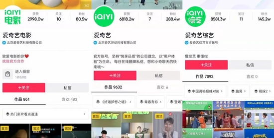 抖音是否通过小程序接入爱奇艺长视频,同样值得观察。目前,爱奇艺在抖音开设6个蓝V账号,除了288万粉丝的主账号外,还设有“爱奇艺电影”“爱奇艺综艺”等子账号。