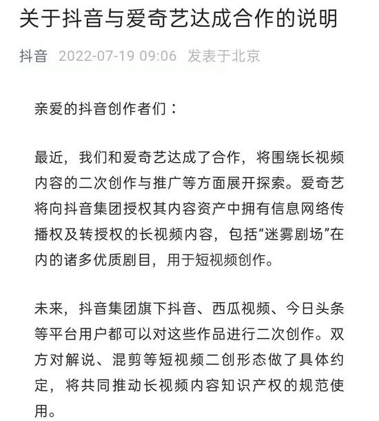 抖音和爱奇艺均在声明中指出,双方对解说、混剪等短视频二创形态做了具体约定,将共同推动长视频内容知识产权的规范使用。