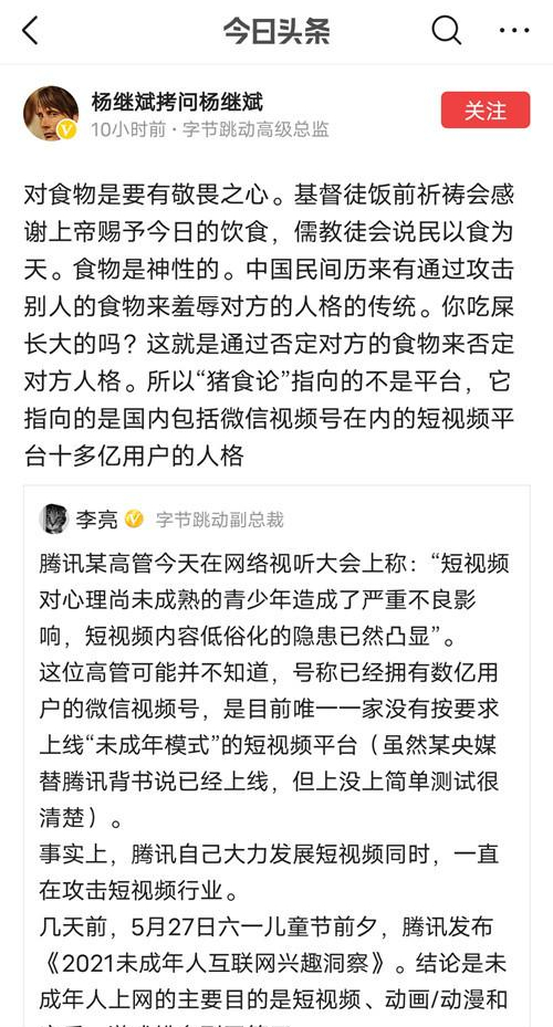 言辞最激烈的是腾讯高管孙怀忠。在他看来,短视频简单重复洗脑、拉低用户心智,对很多青少年造成不良影响。他把这种现象形容为“你喜欢猪食,你看到的全都是猪食。”