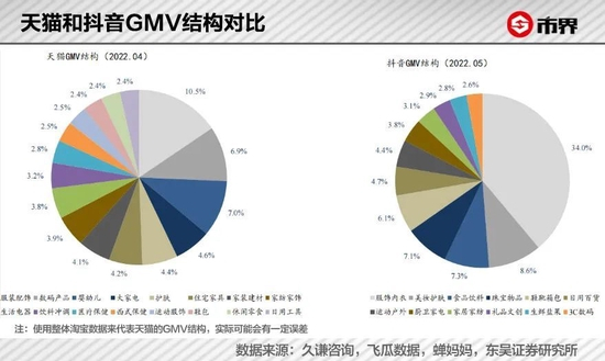 根据东吴证券2022年4-5月统计的数据,相比天猫产品均匀分布,抖音的GMV结构分布中,服饰内衣占比达34%,其次为美妆护肤、食品饮料、珠宝物品、鞋靴箱包等,价格最透明的3C数码占比最少,只有2.6%。
