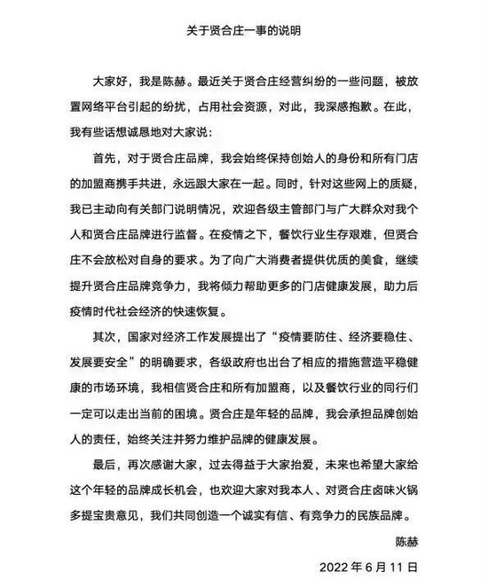 虽陈赫已退出贤合庄股东行列,但事发后,陈赫发表声明,“始终保持创始人的身份与所有门店的加盟商携手共进”。