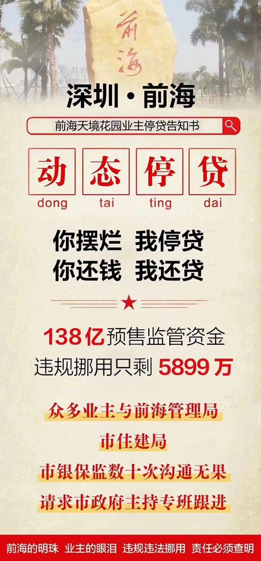 今年5月,前海天境的业主们发现,楼盘似乎陷入停工缓建的状态。随着近期全国多地出现停贷事件,他们也加入到强制停贷的队伍中。此外,在与前海管理局、深圳住建局等多方沟通后,业主们还得知一个惊人消息:截至6月底,监管账户上的138亿预售监管资金仅剩5899万。