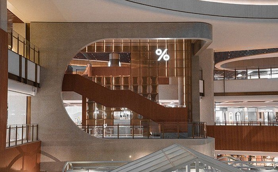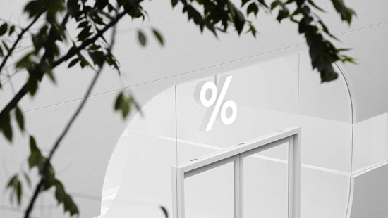 极简也是这个品牌设计风格中最重要的特征——整齐而有序的白色或实木空间,大量使用低饱和度纯色、或白色的冷淡风格,通透明亮的大片玻璃窗,以及醒目且极具辨识度的“%”标识。独特的空间设计以及知名设计师的光环加持,让它在中国有了更多出圈的可能。