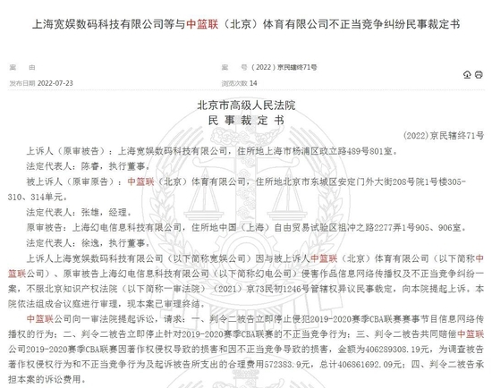 近日,北京市高级人民法院出具《上海宽娱数码科技有限公司等与中篮联(北京)体育有限公司不正当竞争纠纷民事裁定书》。该裁定书显示,因哔哩哔哩(bilibili,俗称“B站”)未经授权便大规模向公众提供CBA赛事视频的点播服务,中篮联(北京)体育有限公司(简称“CBA公司”)起诉至北京市知识产权法院,向哔哩哔哩的经营者上海幻电信息科技有限公司、上海宽娱数码科技有限公司索赔406289308.19元。