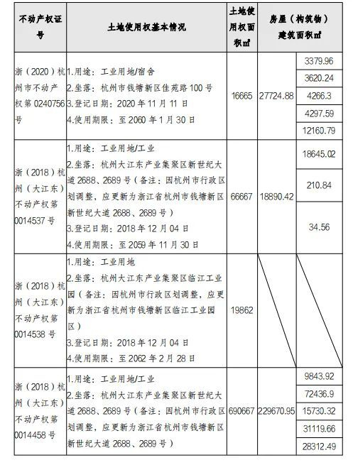 其中,不动产包括杭州市钱塘新区佳苑路100号、浙江省杭州市钱塘新区世纪大道2688号和2689号、浙江省杭州市钱塘新区临江工业园区等工业用地,土地使用权面积约79.39万平方米。