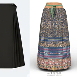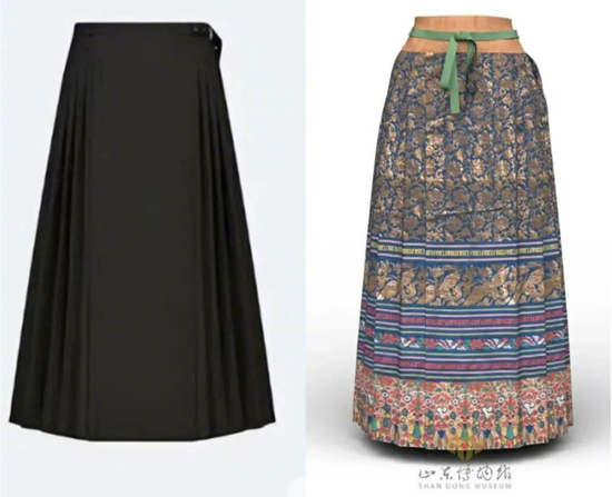 左为迪奥官网售卖的中长半身裙,右为山东博物馆的藏品明代蓝色缠枝四季花织金妆花锻裙。