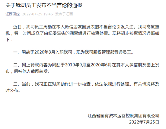 江西省国有资本运营控股集团有限公司2022年7月25日发布通报:近日,我司员工周劼在本人微信朋友圈发表的不当言论引发关注。我司高度重视,第一时间成立了由纪委牵头的调查组进行核查处置。