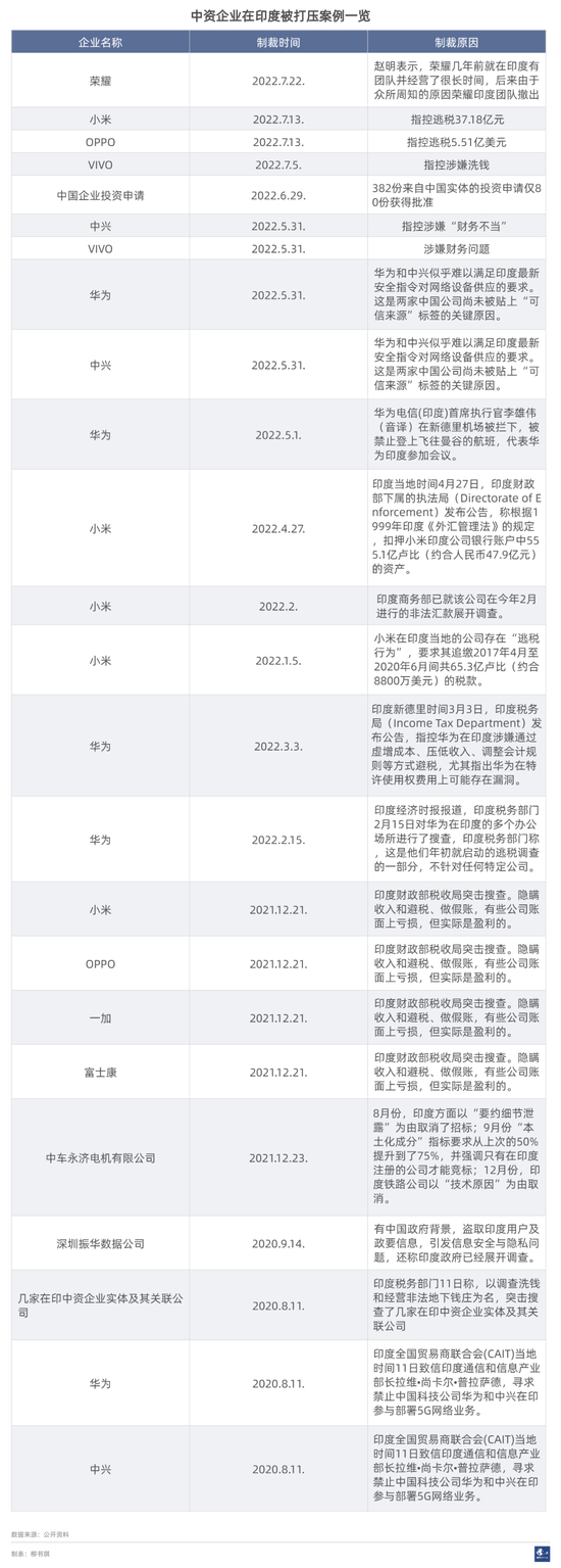 今年以来,针对中国企业的限制愈演愈烈。小米因涉嫌逃税,先于今年1月被追缴65.3亿卢比(约5.6亿元)的税款,后又在4月被冻结7.25亿美元(后解除冻结)。今年7月初,vivo又因涉嫌洗钱,被封锁了在印度的119个银行账户,共计46.5亿卢比(约3.9亿元)。OPPO、华为、中兴等中国科技企业几乎无一例外遭遇了税务调查。