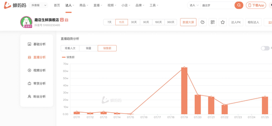 再看趣店旗下官方账号“趣店生鲜旗舰店”的抖音直播间数据,在罗老板高调直播之前,旗舰店日销量最高不到9000件,日销售额最高仅有20万。但7月19日,由于罗敏带货的热度余存,旗舰店销量达4.4万件,销售额高达65.2万,20日之后便趋于平淡。