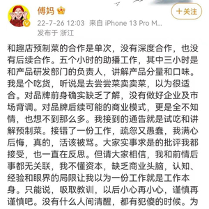 今天,艺人傅首尔、贾乃亮相继为“与趣店预制菜合作”一事道歉。