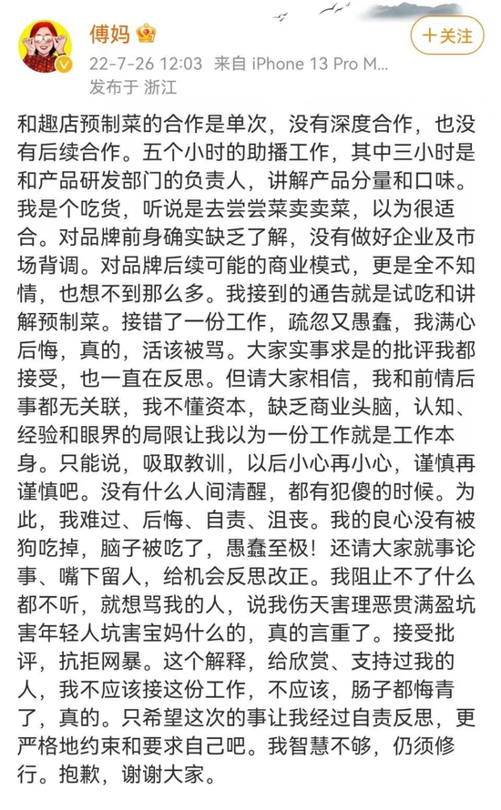今天下午,扛不住舆论压力的傅首尔先在微博上发布长文,向广大网友们道歉,“接错了一份工作,疏忽又愚蠢,活该被骂”!