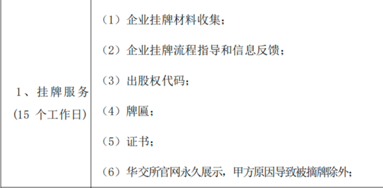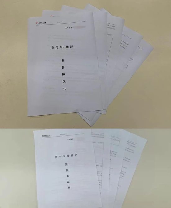 记者看到,在“不带融资”的《香港OTC挂牌服务协议书》中,乙方的服务内容主要包括挂牌服务、专场挂牌仪式、媒体宣传、专场宣传片、纳斯达克大屏、企业IPO辅导,费用是50万元。