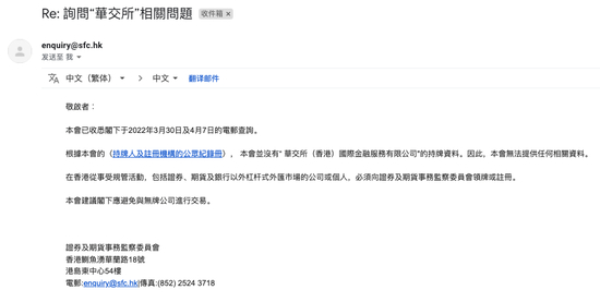 为了进一步求证华交所的性质,记者以投资人身份通过电邮联系了香港证监会,询问是否知晓这家公司。