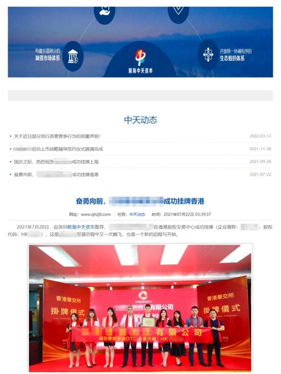 在网站显眼位置,记者并没有发现与华交所有关的信息。但在“中天动态”栏目中,看到了一篇《×××公司成功挂牌香港》的文章,图片里的信息显示,这家公司“挂牌”的地点就是华交所。