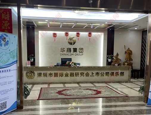 记者继续往里走,看到了华商集团的标识。另外,在前台处,还标有“深圳市国际金融研究会上市公司俱乐部”的字样。