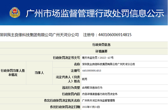 行政处罚决定书显示,2022年4月21日,广州市天河区市场监督管理局执法人员根据群众举报,对我主良缘天河分公司涉嫌发布或者利用虚假信息,诱人订立合同进行立案调查。通过询问调查及收集有关证据资料查明,2021年7月,我主良缘天河分公司的销售人员通过微信聊天向消费者介绍会员信息时,存在对会员工作及学历信息方面的不实内容。已为消费者办理退款6660元。