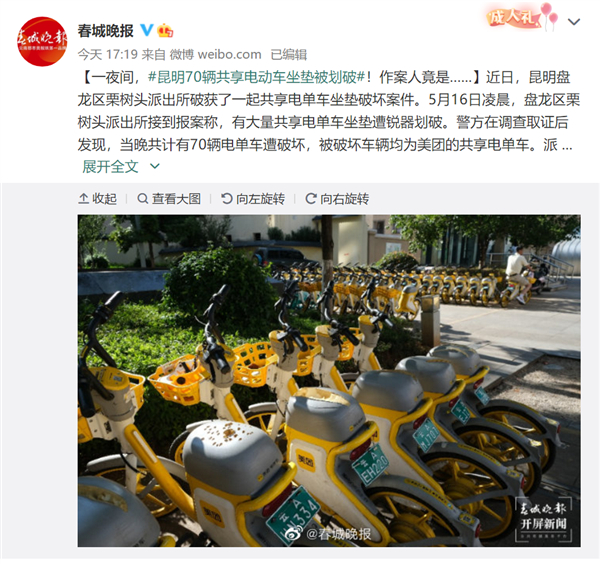 哈啰经理划破70辆美团单车被拘 故意毁坏财物:网友直呼敬业程度无敌