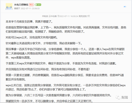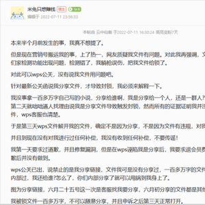然而这一声明却遭到原作者回击。米兔在论坛上回应称,自己没有说过WPS删除本地文件,实为营销号误传;但自己也没有对外分享过文件,而是依照WPS客服要求才分享给了对方。她同时强调“文件没有问题,是他们家检测功能出现问题,检测错了,我躺枪误伤,把我文件给锁了”。