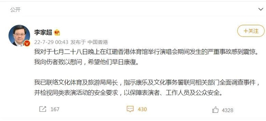 香港特区行政长官李家超29日凌晨发表声明称,已联络文化体育及旅游局局长杨润雄,指示康乐及文化事务署联同相关部门全面调查事件,并检视同类表演活动的安全要求,以保障表演者、工作人员及公众安全。