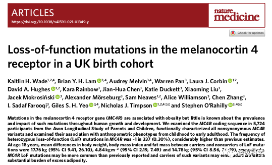 2021年6月的《自然 医学》杂志,发表了英国Bristol大学Nicholas Timpson和Stephen O’Rahilly两个实验室合作的文章。