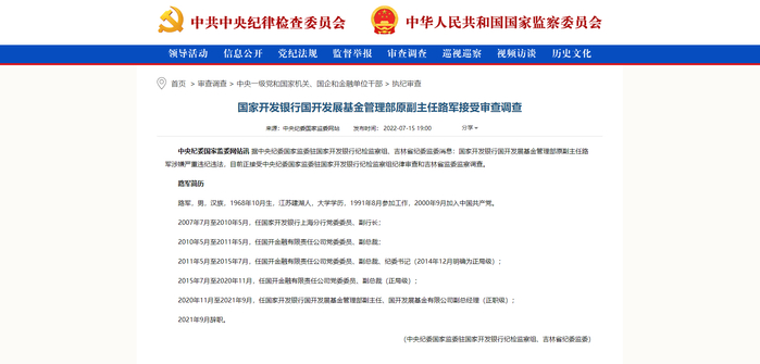 此外,据7月15日中央纪委国家监委网站发布内容显示,国家开发银行国开发展基金管理部原副主任路军涉嫌严重违纪违法,正接受中央纪委国家监委驻国家开发银行纪检监察组纪律审查和吉林省监委监察调查。路军还是原华芯投资管理公司总裁,并参与了大基金的管理。而据媒体报道,在路军接受调查的同一天,深圳鸿泰基金投资管理有限公司合伙人王文忠也被有关部门带走。