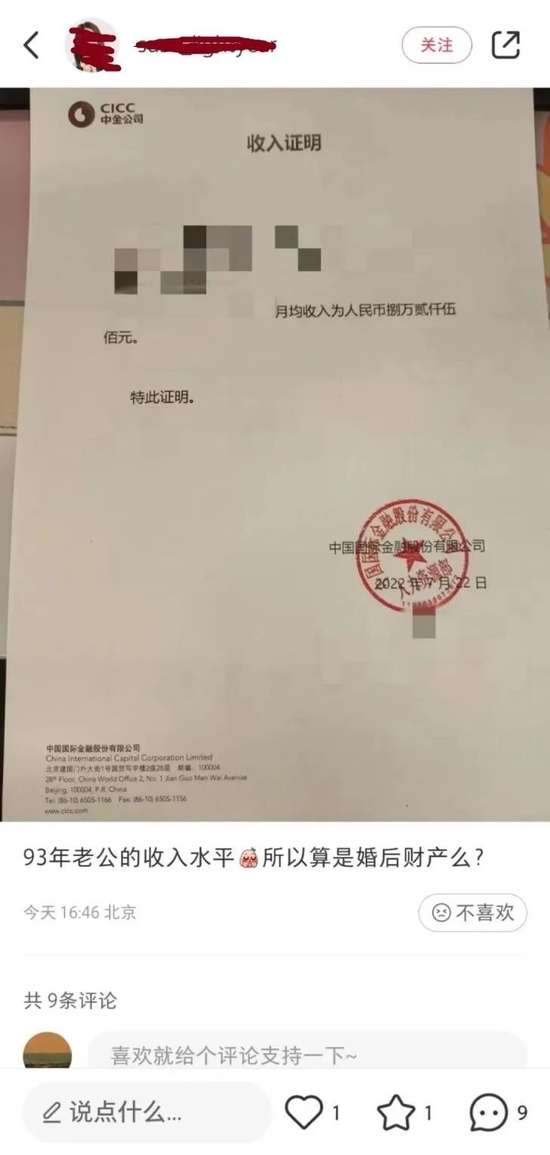 月入超8万?博主晒90后中金公司老公收入证明:“算婚后财产吗?”