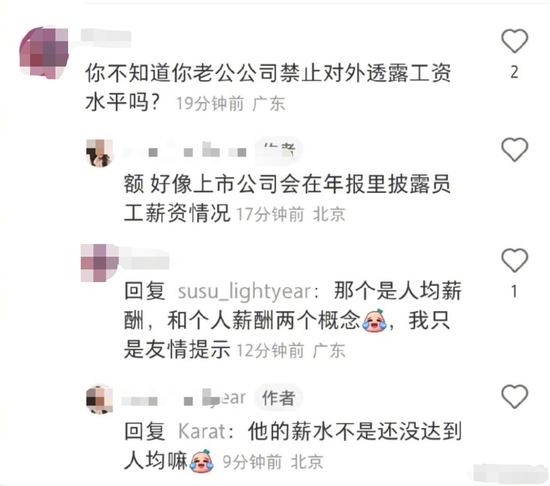 不过,她的行为也遭到了网友的议论。有网友提醒:你不知道你老公公司禁止对外透露工资水平吗?她回复:好像上市公司会在年报里披露员工工资情况,并轻微吐槽:“他的薪水不是还没达到人均嘛”。