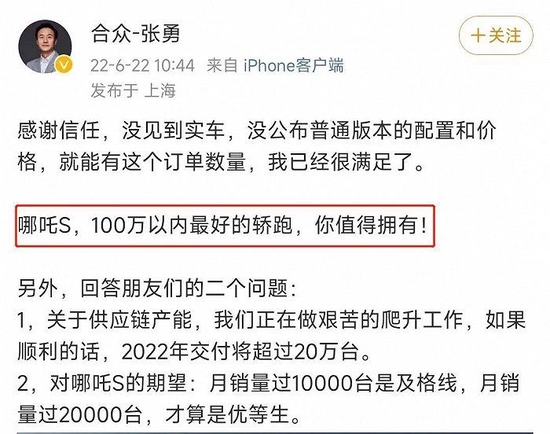 由此,在今年6月张勇曾评价哪吒S是“100万元以内的最好的轿跑”;而在提及销量方面,张勇在上市发布会上表示,基于哪吒S的助力,哪吒要在今年内拿下造车新势力销量第一的宝座。