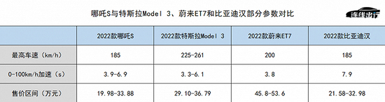 其次从动力性能来看。哪吒S全系车型的最高车速都为185km/h,0-100km/h加速为3.9-6.9秒;相比之下,特斯拉Model 3和蔚来ET7的最高车速都可达到261km/h和200km/h;而在0-100km/h加速方面,特斯拉Model 3可实现3.3秒,差距明显。