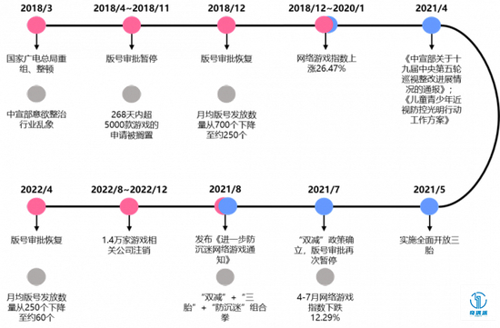 2021年8月,监管对于游戏政策收紧的信号明确。对应此前2018年3月至9月的阶段,机构改革开启监管收紧以整治游戏行业的内乱,此次则为宏观调控游戏总量,并推崇精品游戏的文化价值、鼓励游戏产品出海。
