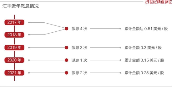 2020年派息一次,只有0.15美元/股。2021年汇丰派息增加到2次,全年累计派息每股0.25美元,与三年前相比缩水一半。