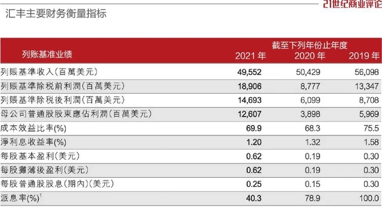 2021年稍有起色,净利润回升至126亿美元,收入还是下降2%,至496亿美元。汇丰将原因归于全球银行利率下跌,息差收窄,以及资本市场及证券服务收入减少等。