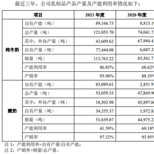 招股书显示,2019年公司的纯牛奶和酸奶自有产能为0,全部来自外协生产。2020年有少许的自有产能投入,但超过九成来自外协厂商。