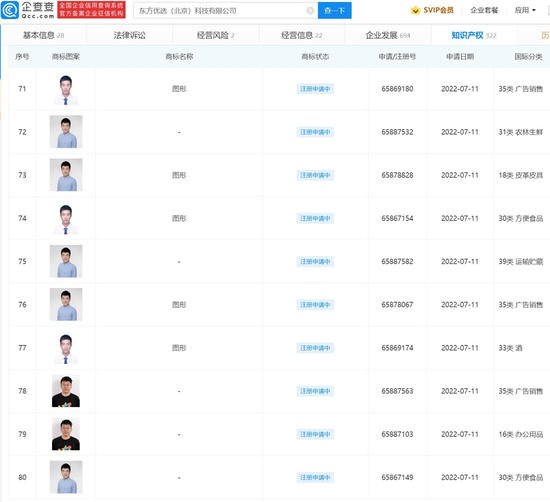 近日,东方优选(北京)科技有限公司申请注册多个东方臻选直播间主播肖像商标,其中包括“董宇辉、孙佳琦、孙楚涵”等人的肖像。商标国际分类包含教育娱乐、广告销售、农林生鲜、皮革皮具、方便食品、办公用品等。目前该批商标申请进度显示:注册申请中。