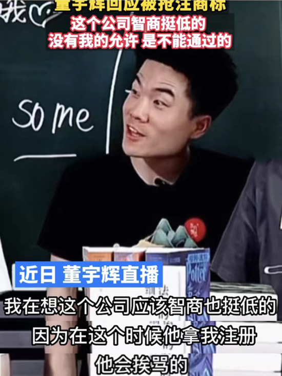 董宇辉还表示,上海商标局的同学告诉他,他们也不能理解这种行为,因为没有本人同意,这是不可能通过的。“所以读书真的很重要,要不然你连想占便宜都占不上。”