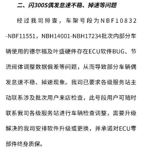 钱江摩托发布的《解答》中称,针对闪300S偶发怠速不稳、掉速等问题,公司已要求各级服务站主动联系涉及批次用户来店检查,需要升级解决的公司安排软件升级或更换,并承诺对ECU零部件终身质保。
