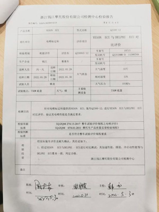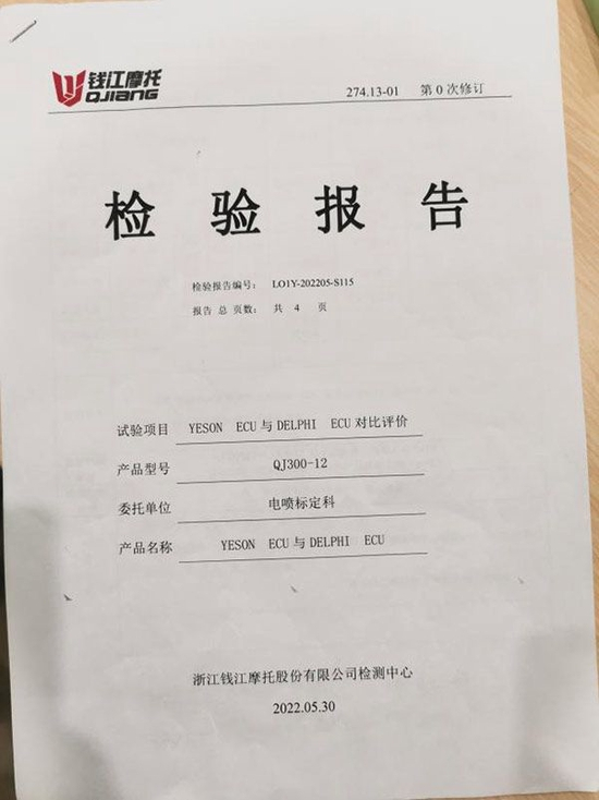 “5月30日,公司针对电喷标定科提供的YESON ECU装车QJ300-12进行YESON(叶盛) ECU和DELPHI(德尔福) ECU进行对比评价检验工作,得出以下结论:YESON ECU加速性能,排放,冷启动性能等与DELPHI ECU基本一致,判定合格。”该负责人表示。