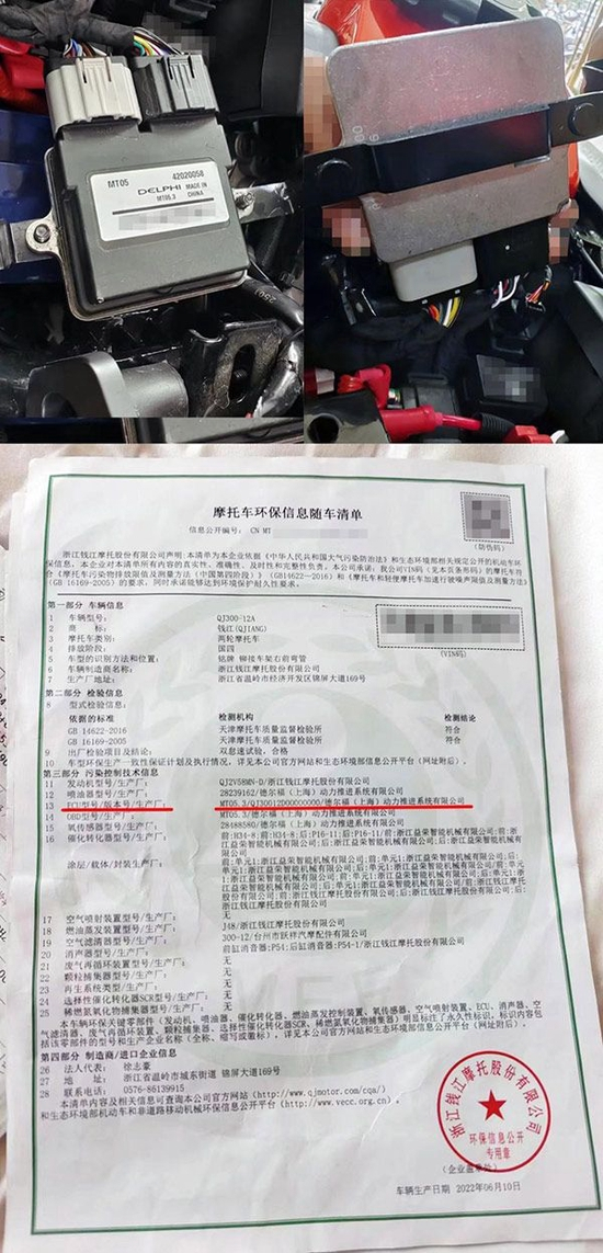 通过第二次与经销商联系以及后续检查,林炜得知摩托车出现诸多问题的根源是ECU货不对版,车辆出厂环保信息清单显示为美国德尔福品牌,实际车载则是国产叶盛品牌。