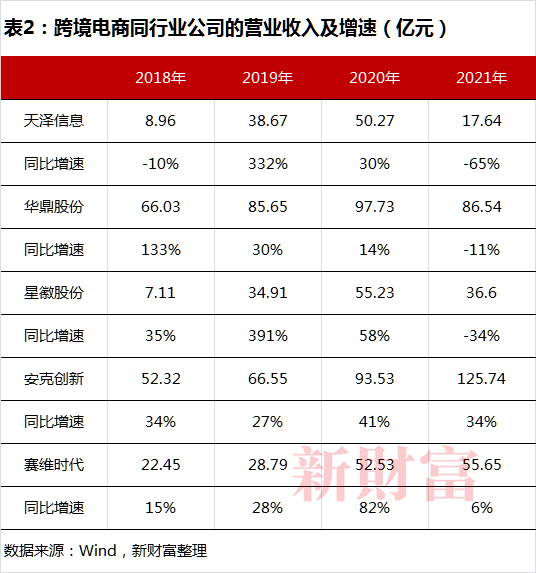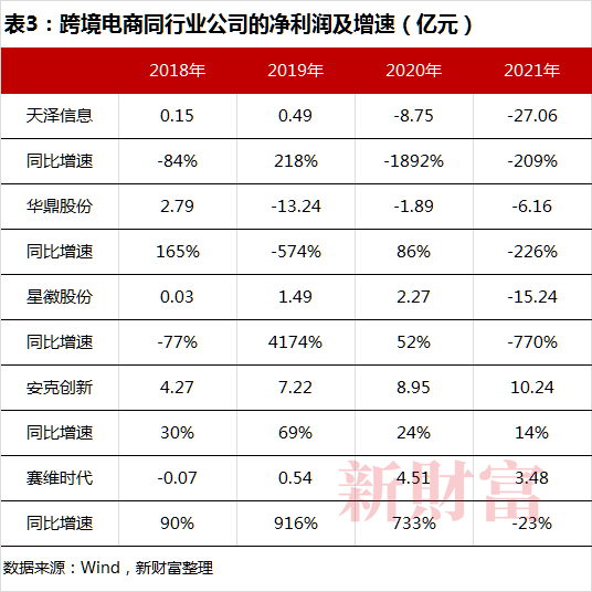 这让此前红红火火的跨境电商上市公司业绩陡然变脸。2021年,天泽信息、华鼎股份、星徽股份等营收大幅下滑,且净利润均为负数,赛维时代营收虽保持6%的微弱增长,净利润增速已然为负,仅有安克科技保持较为稳健的增长(表2、3)。
