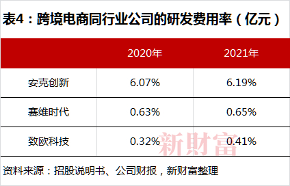 其三,安克创新注重自研水平的提高,其研发投入比约在6%,显著高于赛维时代等同行(表4)。早在2018年,其研发人员共计642人,占公司总人数的比例已超50%。而赛维时代主要的投入方向还是销售费用。