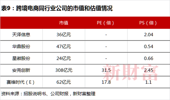 据招股书披露,赛维时代此次IPO拟募集资金6.2亿元,总股本为3.6亿股,拟发行股份不超过4010万股,占发行后总股本的比例不低于10%,则其预期每股最低发行价为15.46元/股,对应发行后总估值为62亿元。比对2021年业绩,则其上市后市盈率约为18倍,市销率约1倍,低于安克创新,但高于星徽股份、华鼎股份(表9)。